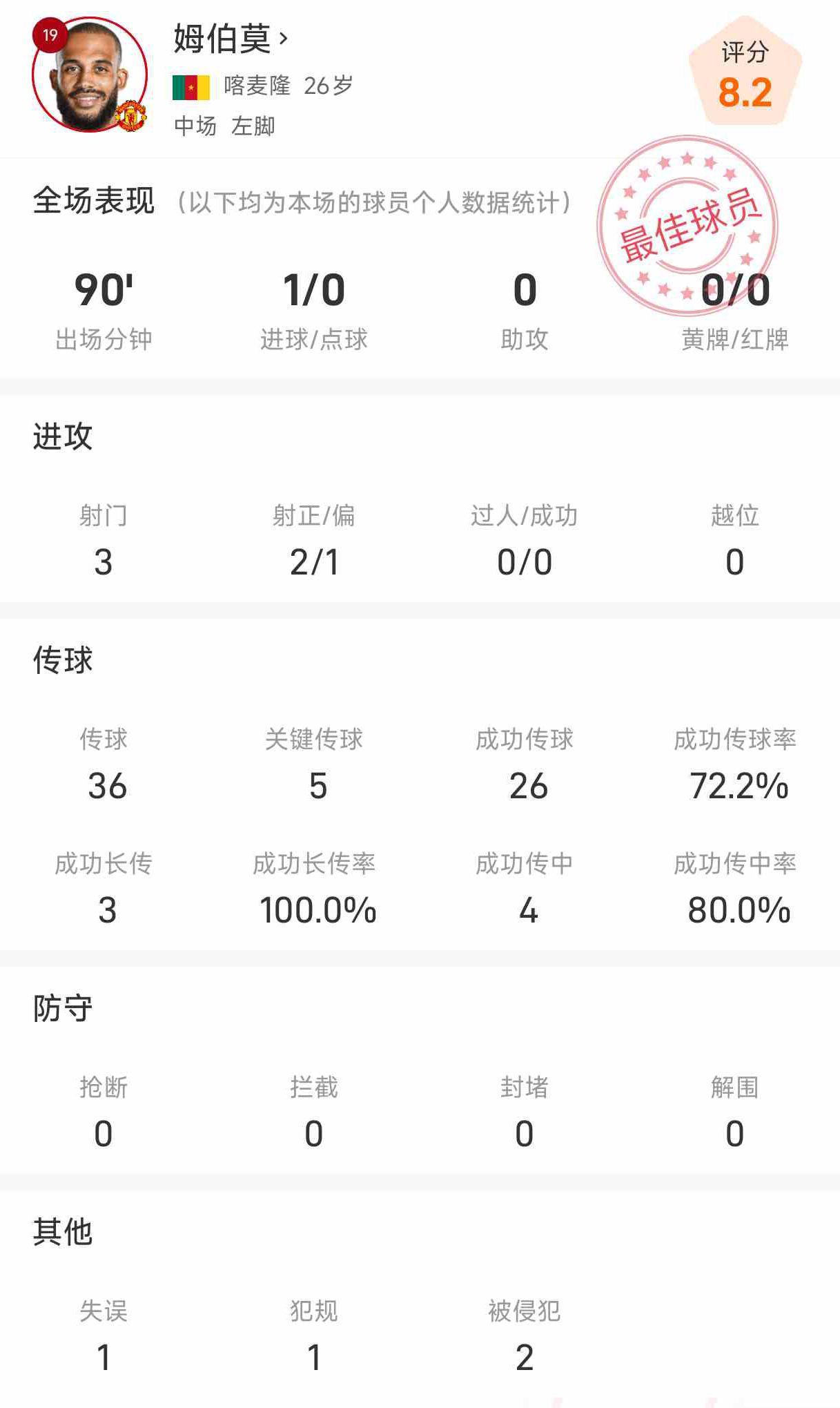 雷速体育8月31日讯 英超第3轮,曼联主场3-2险胜伯恩利。此役姆伯莫首发出场并且踢满了全场,比赛中他打入了1球。