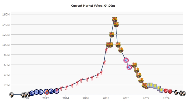 回顾其职业生涯,库蒂尼奥曾是身价破亿的顶级球星,2018年以1.35亿欧元从利物浦转会巴塞罗那,巅峰时期身价一度冲至1.5亿欧元。然而此后他的身价持续下滑,辗转拜仁、阿斯顿维拉、杜海勒和瓦斯科达迦马等队,都未能重现当年风采。