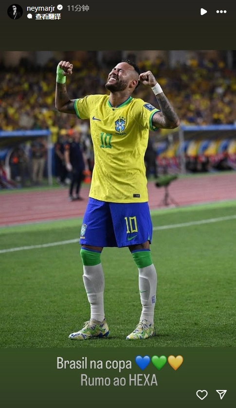 赛后33岁的巴西射手王内马尔发文祝贺巴西:挺进世界杯,冲击第六冠。