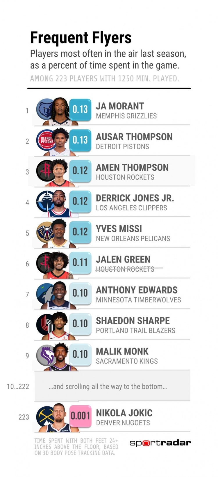 开云APP-上赛季滞空时长排名:莫兰特与汤普森兄弟领跑,约基奇以0.001%垫底